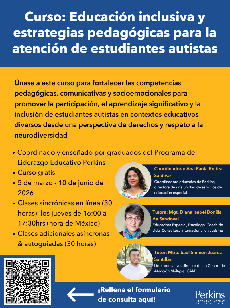 Descripción de la imagen: Afiche digital amarillo de un evento virtual titulado Educación inclusiva y estrategias pedagógicas para la atención de estudiantes autistas, programado para el 5 de marzo hasta el 10 de junio de 2026. El texto debajo del título dice: ‘Únase a este curso para fortalecer las competencias pedagógicas, comunicativas y socioemocionales para promover la participación, el aprendizaje significativo y la inclusión de estudiantes autistas en contextos educativos diversos desde una perspectiva de derechos y respeto a la neurodiversidad.’ Los detalles enumerados sobre el curso son que está coordinado y enseñado por graduados del Programa de Liderazgo Educativo de Perkins, es un curso gratis, hay 30 horas de clases sincrónicas en línea los jueves de 16:00 a 17:30hrs (hora de México) y 30 horas de clases asíncronas y autoguiadas. En el lado derecho hay tres fotos circulares con las tomas de cabeza de la coordinadora y los tutores y sus nombres y puestos (Ana Paola Rodea Saldívar: Coordinadora educativa de Perkins, directora de una unidad de servicios de educación especial; Diana Isabel Bonilla de Sandoval: Educadora Especial, Psicóloga, Coach de vida, Consultora internacional en autismo; Saúl Shimón Juárez Santillán: Líder educativo, director de un Centro de Atención Múltiple (CAM)). En la parte inferior están el logo de Perkins y un código QR con una flecha que dice ‘¡Rellena el formulario de consulta aquí!’