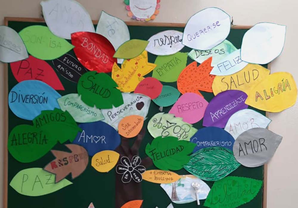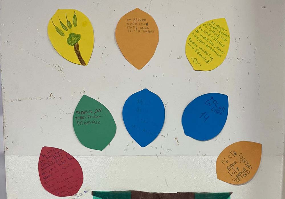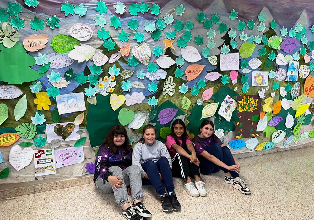 Las siguientes imágenes muestran el resultado de la actividad “Construyendo el bosque de tus sueños “, realizadas en diferentes escuelas argentinas. Imágenes de un árbol de papel pegado sobre la pared de la escuela, con hojas escritas por las familias con mensajes, sueños y expectativas sobre el trabajo conjunto con la escuela.