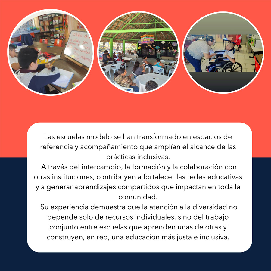 Uma escola modelo, comprometida com processos de melhoria contínua, ao longo do tempo, ganha experiências, fortalece-se com ferramentas que desenvolvem seu trabalho colaborativo e aprofundam as reflexões sobre a prática. Isso consolida um novo papel: tornar-se uma escola de referência que compartilha com outras instituições, inspirando estratégias de inclusão e fortalecendo a capacidade das comunidades educativas de aprenderem juntas.